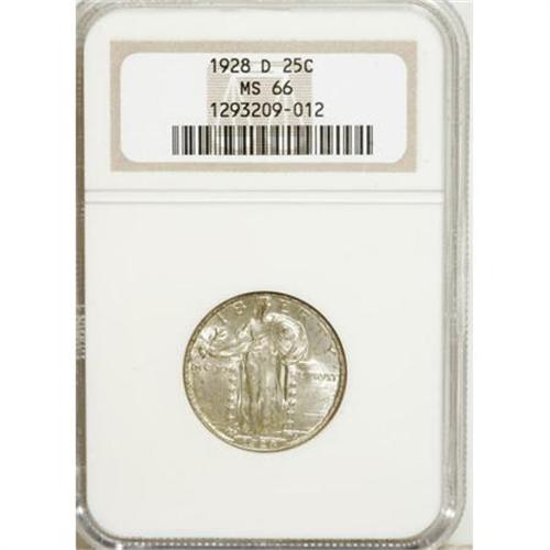 <B>1928-D 25C MS66 NGC.</B></I> Intense luster radiates from the impeccably preserved surfaces of this Premium Gem, and the design elements have been in receipt of a well executed strike. Essentially untoned, except for a wisp or two of brown color. Census: 90 in 66, 9 finer (10/07).<BR><BR><B>Coin Engraver:</B> Hermon A. MacNeil<BR><BR><b>Shipping:</b> Coins & Currency (<a target="_blank" href="http://www.heritageauctions.com/common/shipping.php">view shipping information</a>)