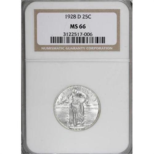 <B>1928-D 25C MS66 NGC.</B></I> NGC Census: (91/9). PCGS Population (69/2). Mintage: 1,627,600. Numismedia Wsl. Price for NGC/PCGS coin in MS66: $650. (#5768)<BR><BR><B>Coin Engraver:</B> Hermon A. MacNeil<BR><BR><b>Shipping:</b> Coins & Currency (<a target="_blank" href="http://www.heritageauctions.com/common/shipping.php">view shipping information</a>)