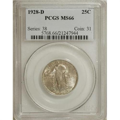 <B>1928-D 25C MS66 PCGS.</B></I> PCGS Population (66/2). NGC Census: (90/9). Mintage: 1,627,600. Numismedia Wsl. Price for NGC/PCGS coin in MS66: $650. (#5768)<BR><BR><B>Coin Engraver:</B> Hermon A. MacNeil<BR><BR><b>Shipping:</b> Coins & Currency (<a target="_blank" href="http://www.heritageauctions.com/common/shipping.php">view shipping information</a>\)