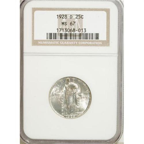 <B>1928-D 25C MS67 NGC.</B></I> Radiantly lustrous, with just a touch or two of light gold-tan color. The surfaces are near pristine, and exhibit a better-than-average strike on this normally weakly-impressed issue. Neither NGC or PCGS has graded any finer. Census: 9 in 67, 0 finer (10/07).<BR><BR><B>Coin Engraver:</B> Hermon A. MacNeil<BR><BR><b>Shipping:</b> Coins & Currency (<a target="_blank" href="http://www.heritageauctions.com/common/shipping.php">view shipping information</a>)