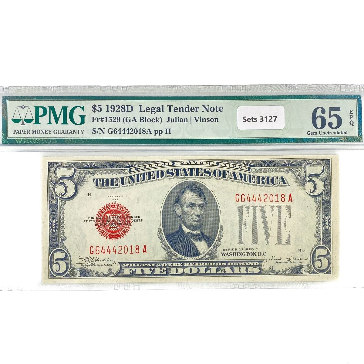 1928 D $5 Legal Tender Note PMG GEM UNC 65