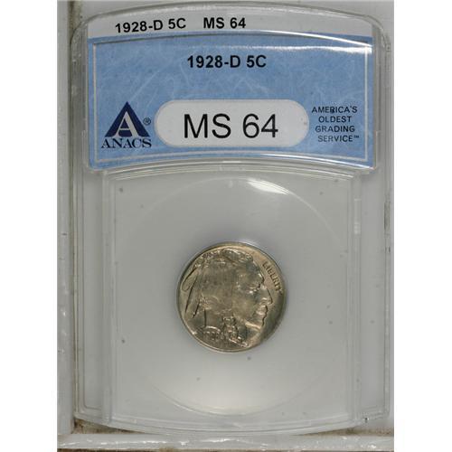 <B>1928-D 5C MS64 ANACS.</B></I> NGC Census: (733/120). PCGS Population (1057/305). Mintage: 6,436,000. Numismedia Wsl. Price: $112. (#3964)<BR><BR><b>Shipping:</b> Coins & Currency (<a target="_blank" href="http://www.heritageauctions.com/common/shipping.php">view shipping information</a>)