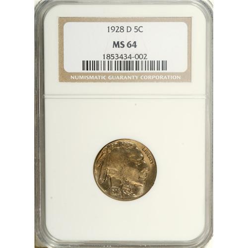 <B>1928-D 5C MS64 NGC.</B></I> NGC Census: (733/122). PCGS Population (1033/0). Mintage: 6,436,000. Numismedia Wsl. Price for NGC/PCGS coin in MS64: $112. (#3964)<BR><BR><b>Shipping:</b> Coins & Currency (<a target="_blank" href="http://www.heritageauctions.com/common/shipping.php">view shipping information</a>)