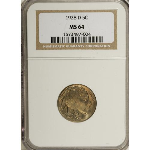 <B>1928-D 5C MS64 NGC.</B></I> NGC Census: (733/122). PCGS Population (1033/308). Mintage: 6,436,000. Numismedia Wsl. Price for NGC/PCGS coin in MS64: $112. (#3964)<BR><BR><b>Shipping:</b> Coins & Currency (<a target="_blank" href="http://www.heritageauctions.com/common/shipping.php">view shipping information</a>)