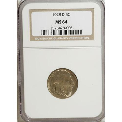 <B>1928-D 5C MS64 NGC.</B></I> NGC Census: (742/122). PCGS Population (1047/314). Mintage: 6,436,000. Numismedia Wsl. Price for NGC/PCGS coin in MS64: $112. (#3964)<BR><BR><B>Coin Engraver:</B> James E. Fraser<BR><BR><b>Shipping:</b> Coins & Currency (<a target="_blank" href="http://www.heritageauctions.com/common/shipping.php">view shipping information</a>\)