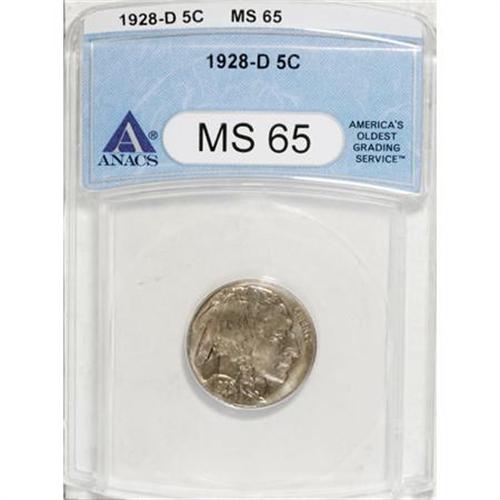 <B>1928-D 5C MS65 ANACS.</B></I> Boldly struck overall and lustrous, with attractive light golden color on the reverse, and well preserved surfaces that are free of distracting marks or abrasions. The bison's head, shoulder, and rear leg are typically soft. <BR><BR><B>Coin Engraver:</B> James E. Fraser<BR><BR><b>Shipping:</b> Coins & Currency (<a target="_blank" href="http://www.heritageauctions.com/common/shipping.php">view shipping information</a>)