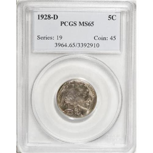 <B>1928-D 5C MS65 PCGS.</B></I> An attractive Gem example, better-defined than average for this Coolidge-era D-mint issue. Thin layers of dusky blue and gold patina grace the luminous surfaces. PCGS has graded just 31 finer examples (7/07).<BR><BR><B>Coin Engraver:</B> James E. Fraser<BR><BR><b>Shipping:</b> Coins & Currency (<a target="_blank" href="http://www.heritageauctions.com/common/shipping.php">view shipping information</a>)