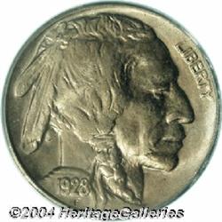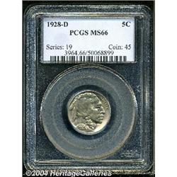 <B>1928-D<5C> MS66 PCGS.</B></I> While the centers are not quite fully struck, this lustrous Gem has extremely clean surfaces and bright salmon-gold patina. LIBERTY and the date are deceptively strike doubled. A conditionally rare issue that is usually encountered with a mediocre strike. Neither NGC nor PCGS have graded a 1928-D Nickel above MS66. Population: 22 in 66, 0 finer (9/04). <BR><BR><B>Important notice:</B> Heritage usually auctions material at the rate of 200-250 lots per hour. On some occasions eBay Live bid software or the Internet may not be able to keep up with the pace of the auction. We recommend placing a realistic absentee bid now as insurance to avoid disappointment. Occasionally the auctioneer may eliminate or reject an eBay Live bid, and the auctioneer may also reopen a lot after the close of the eBay live bidding (usually because we missed an audience bid), and may reject your bid even if it shows you as the winning bidder. By bidding via eBay Live, you agree that Heritage may award the lot to another bidder at its sole discretion under the circumstances described above or any other reasonable circumstances. Since eBay bids are not shown to us until we open the lot on the floor, we treat those bids just like floor bids. In most cases the floor responds before the eBay bid is presented to us, due to Internet lag time, so for consistency we have made it a policy that floor bids are always considered first over tie eBay live bids. Also please note that all Heritage lots purchased through eBay Live carry a 20% Buyer's Premium. Please make sure you read the Terms and Conditions before you bid.
