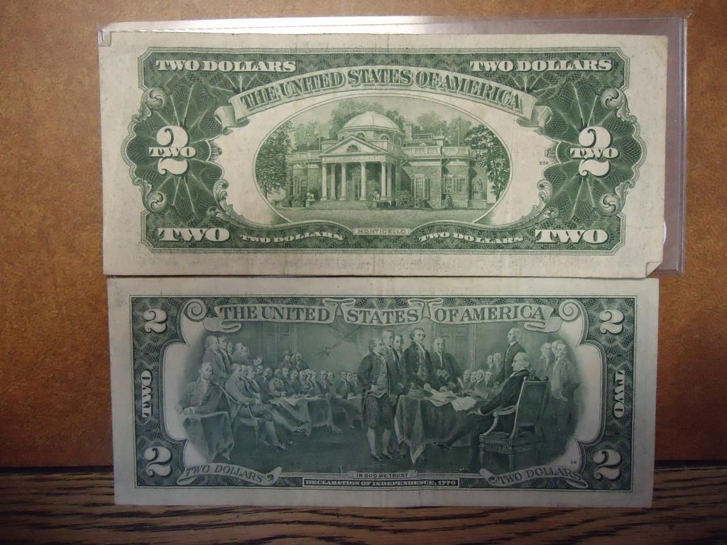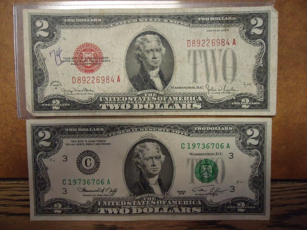 1928-G & 1976 $2 US NOTES 1-RED SEAL, 1-GREEN SEAL