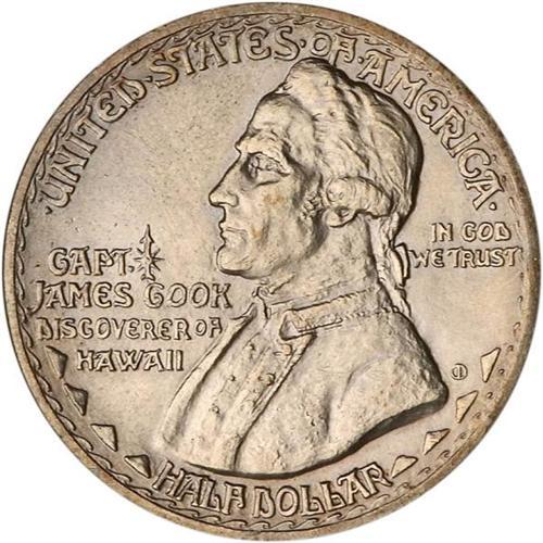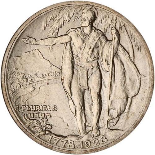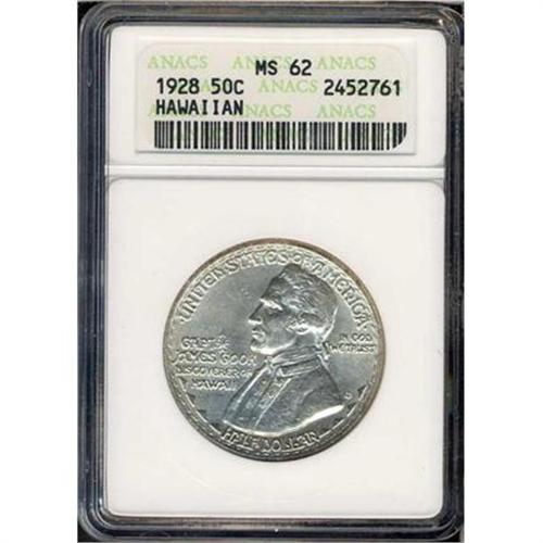 <b>1928 Hawaiian Half Dollar. ANACS graded MS62.</b> Well struck and silvery with ample luster throughout the fields as well as topping the devices. The portrait of Captain Cook (these are known as Captain Cook commemoratives to the collectors in the state of Hawaii) with sharp detail on his coat and wig. The raised triangles along the border below Cook are representations of the 8 inhabited islands of the Hawaiian chain at the time Cook sighted Hawaii in 1778 (Only 7 islands are now inhabited.) <b>(PCGS # 9309)</b>