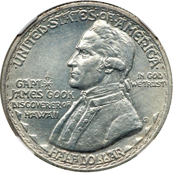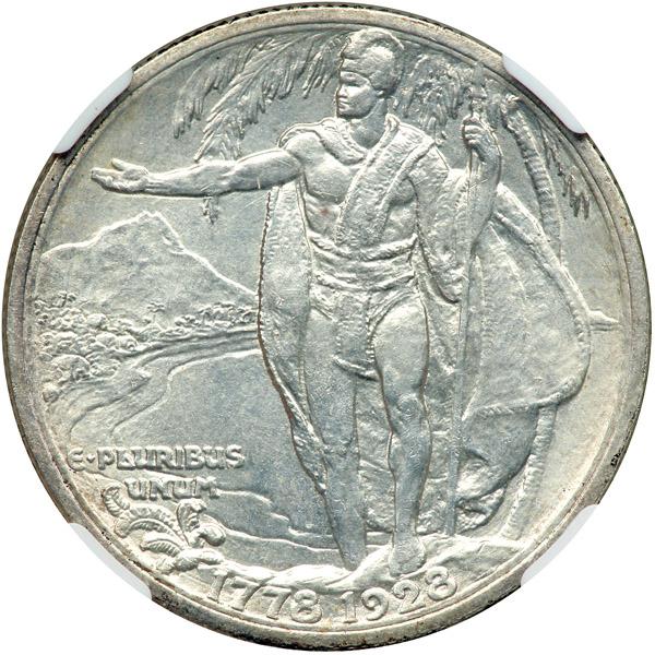 1928 Hawaiian Half Dollar. NGC graded Unc Details, improperly cleaned. A satiny, untoned example and quite nice. Obverse depicts Captain James Cook, the European discoverer of Hawaii who made two visits to the Islands, in 1778 and 1779 (PCGS # 9309) .