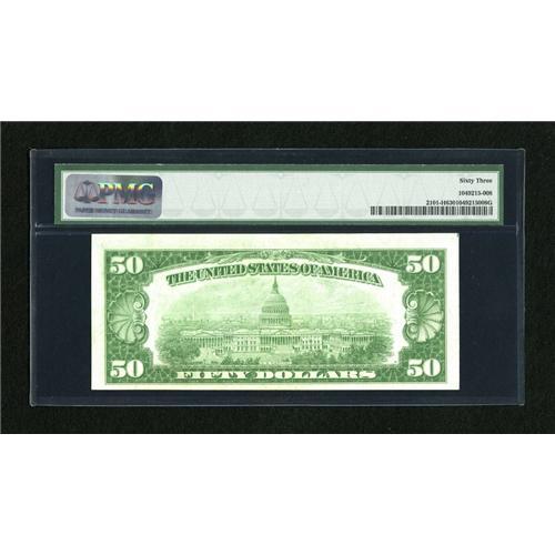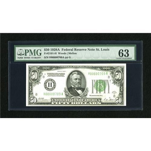 <B>Fr. 2101-H $50 1928A Federal Reserve Note. PMG Choice Uncirculated 63.</B></I><BR>The bright white paper is complemented by a dark green overprint.<BR><BR><b>Shipping:</b> Coins & Currency (<a target="_blank" href="http://www.heritageauctions.com/common/shipping.php">view shipping information</a>)