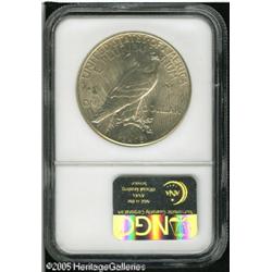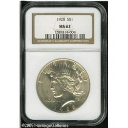 <B>1928<img border='0' src='http://www.heritagecoins.com/images/star.gif' width=10 height=10>$1 MS62 NGC.</B></I> A fully struck and brilliant example of this scarce issue. A few small abrasions are scattered over each side, which account for the grade.<BR><I>From The Banks Collection.</B></I> Lot:10727