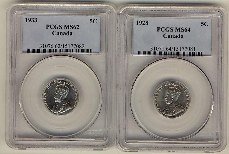 1928 MS64 & 1933 5¢ MS62. Lot of 2 coins both PCGS graded.