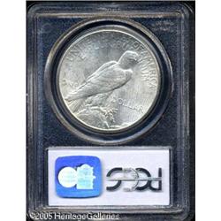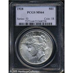 <B>1928<img border='0' src='http://www.heritagecoins.com/images/star.gif' width=10 height=10>$1 MS64 PCGS.</B></I> Well struck and carefully preserved, this attractive near-Gem has an original appearance, which includes a slight degree of speckled red-brown patina near the upper obverse rim, and a pleasing combination of mainly satiny luster on the obverse, with a rather frosty reverse. Minimally abraded, with a handful of marks on the reverse that limit the possibility of a Gem grade assessment. The 1928-P is, of course, one of the key dates in the Peace dollar series. Lot:10730