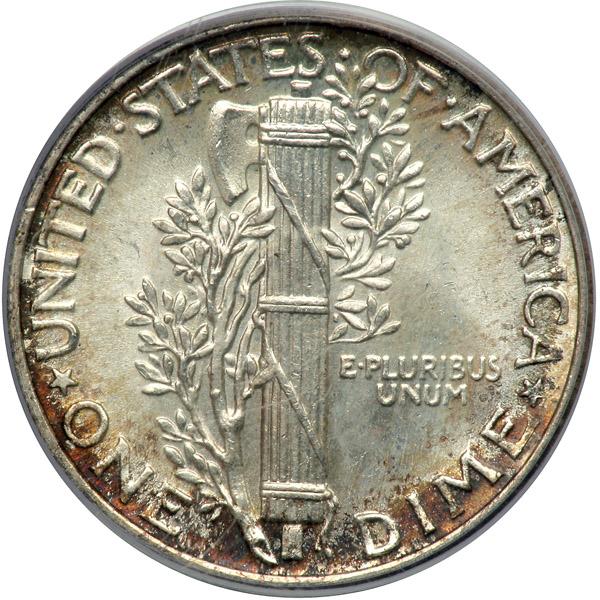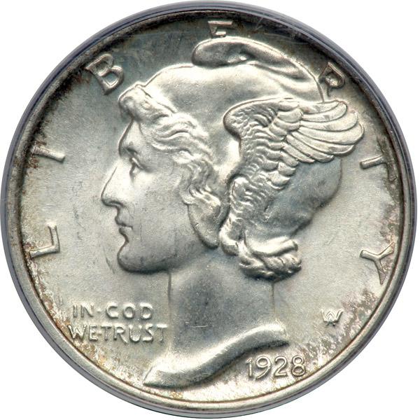 1928 Mercury Dime. PCGS graded MS-66 Full Bands. Lightly toned around the edges. Pop 99; 30 finer, 29 in 67FB, 1 in 67+FB (PCGS # 4967) .