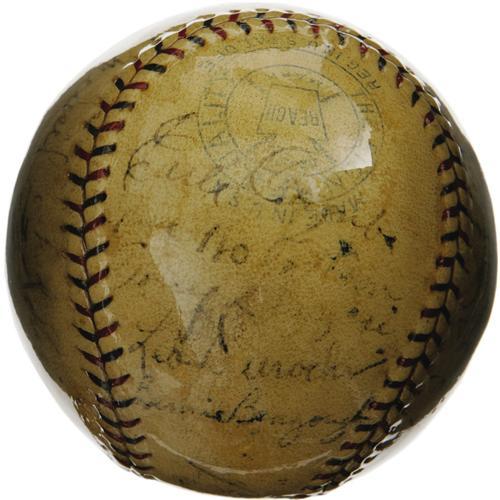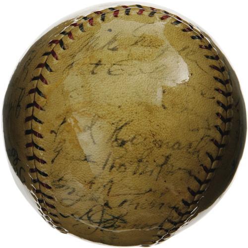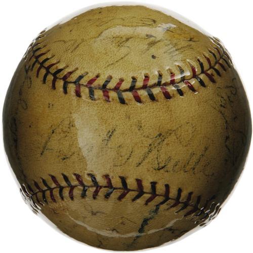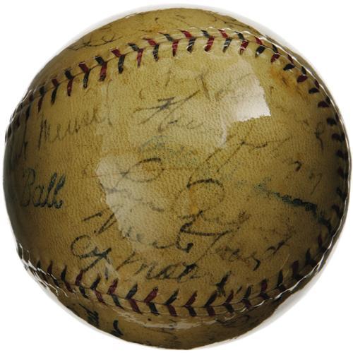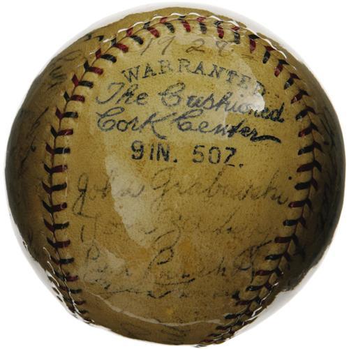 <B>1928 New York Yankees Team Signed Baseball.</B></I> Though the 1927 edition is typically considered the finest of all Yankee squads, the cast of characters in 1928, and the end result of their season's endeavors, are essentially the same. After securing the American League flag with leading numbers in every power-slugging category, the Yanks cruised to their second consecutive Series sweep in a rematch of the 1926 Fall Classic against the St. Louis Cardinals. A thick and glossy coating of shellac has managed to maintain the easy legibility of almost all twenty-four autographs present on this OAL (Johnson) ball, notably Ruth (5/10), Gehrig (6/10), Lazzeri (3/10), Dickey (2/10), Pennock (6/10), Combs (5/10), Durocher (5/10), Hoyt (6/10), Meusel (5/10) and Moore (7/10). The balance of the signatures averages about 4/10. A solid representation of a team sphere from this earliest and greatest of all Yankee dynasties. <I>LOA from PSA/DNA. LOA from James Spence Authentication.</B></I><BR><BR><b>Shipping:</b> Balls, Pucks, etc., Small (<a target="_blank" href="http://www.heritageauctions.com/common/shipping.php">view shipping information</a>)