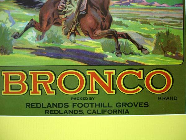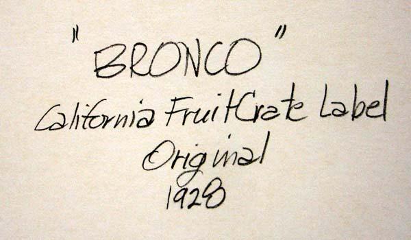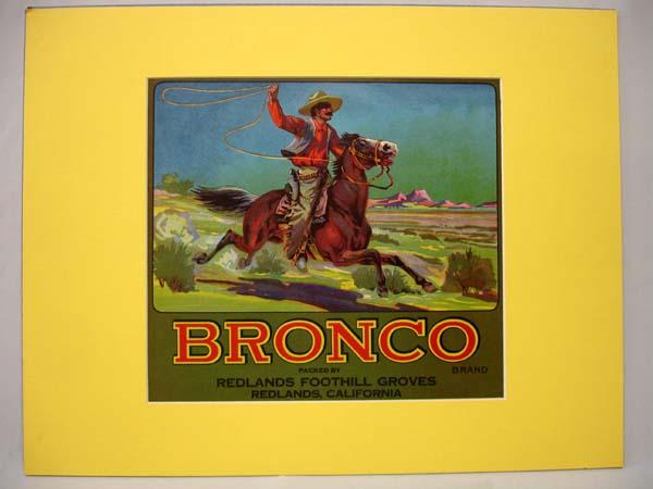 1928 Original ''Bronco'' California Fruit Box Label Matted. Visual is 10.5''x9.5''. Buyers Pay Actual Shipping and Handling Charges(see terms and conditions for more information).