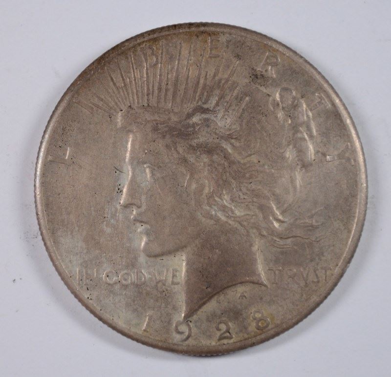 1928 PEACE SILVER DOLLAR, AU TONED, KEY