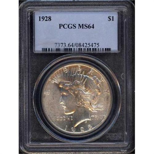 <b>1928 Peace Dollar. PCGS graded MS64.</b> The limited number of Gem survivors never are much more expensive than this attractive "nearly there" MS64, a coin with enough showy surface to excite bidders when they appear at sale to bid. In addition to unqualified technical sharpness, this coin's desirability is enhanced by beautiful light toning <b>(PCGS # 7373)</b>