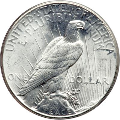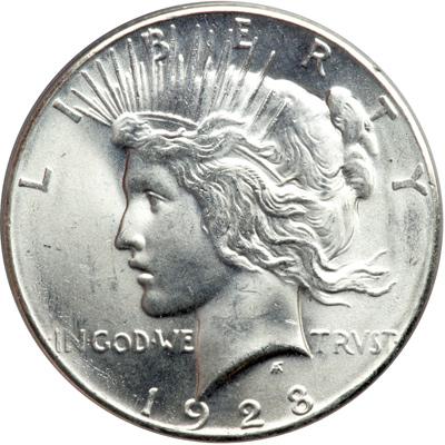 1928 Peace Dollar. PCGS graded MS-64. A nice white coin. Lowest mintage among Peace dollars: 360,649. This is an exceptional and attractive '28-P Dollar with a soft satin-like finish that is not at all uncommon for the date. The veil of satin glows. Both sides are untoned with extensive luster over the nearly bagmark-free devices. We do note a minor scuff at the last A in AMERICA, possibly keeping this piece from slipping into the next higher grade. Other than this, both the striking quality and the surface condition draw praise (PCGS # 7373) .