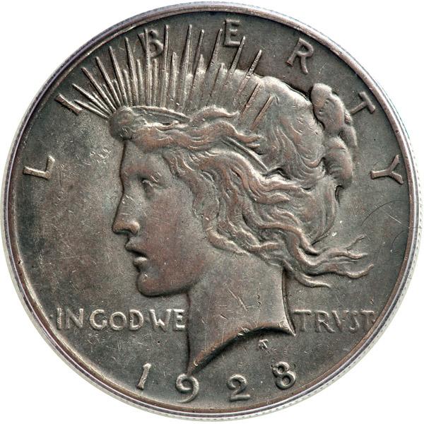1928 Peace Dollar. PCGS graded Genuine. Sharpness of XF Dark even toning on both sides. A popular key date whose mintage of 360,649 attracts collectors (PCGS # 7373) .