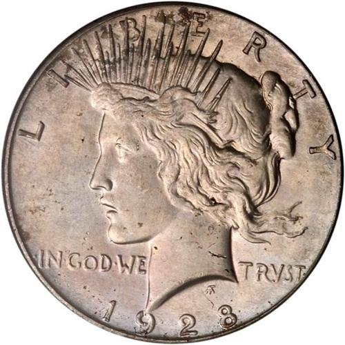 <b>1928 Peace Dollar. PCGS graded MS64.</b> Low mintage date. A light hairline on the chin, and a small chattermark in the field at GOD. What is most desirable when examines this coin is its smooth luster and light accented toning. A coin whose beauty is prominently on display <b>(PCGS # 7373)</b> <i>