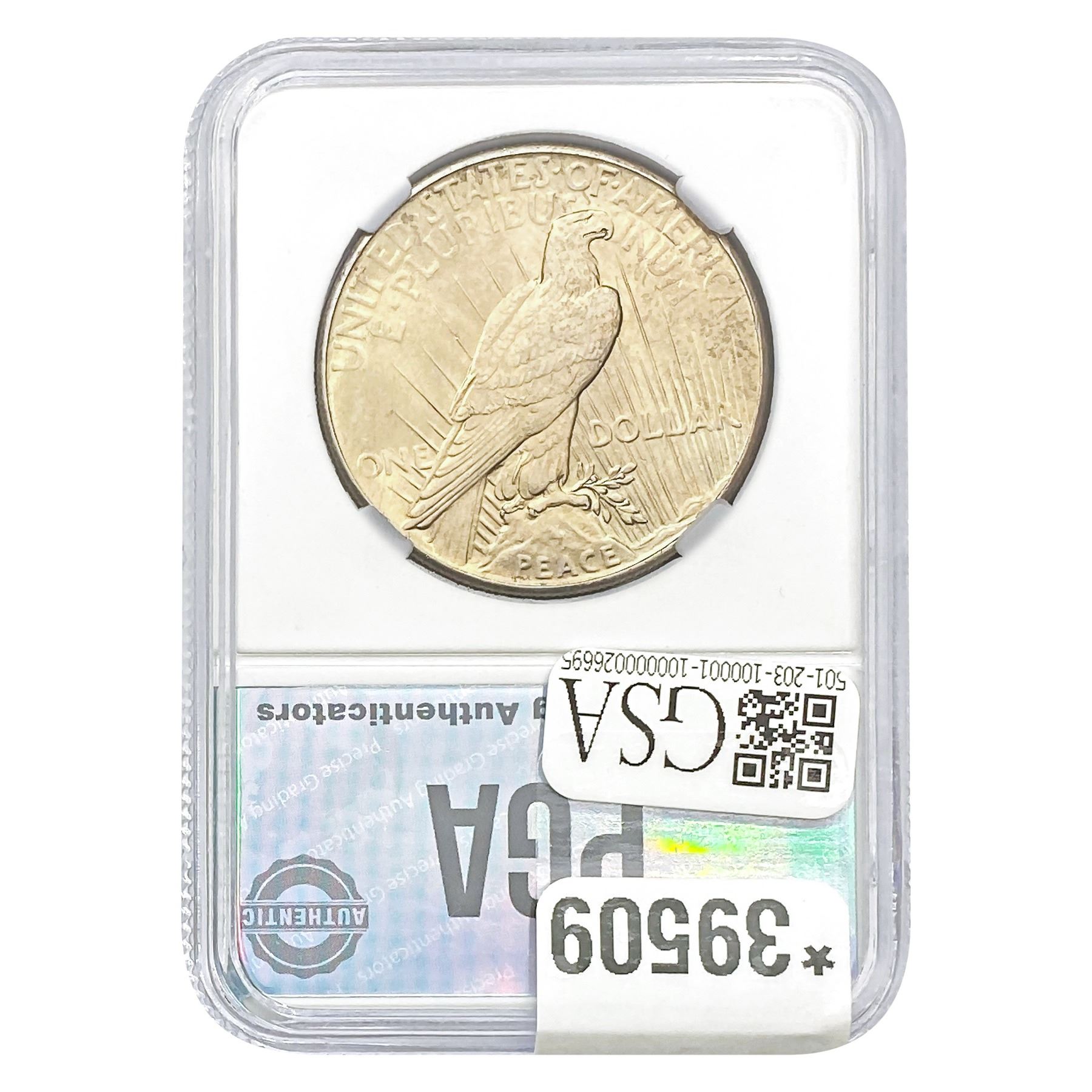 COINS AND CURRENCY LISTED IN GSA’S CATALOG AS GRADED AND ENCAPSULATED BY PCGS, NGC, ANACS, ICG, PCGS CURRENCY, PMG, PCGS BANKNOTE GRADING, CMC OR ANY OTHER THIRD-PARTY GRADING SERVICE ARE LIKEWISE SOLD “AS-IS” EXCEPT AS EXPRESSLY SET FORTH HEREIN. ALL THIRD-PARTY GRADING SERVICE GUARANTEES, INCLUDING AUTHENTICITY, ARE THE SOLE RESPONSIBILITY OF THE THIRD-PARTY GRADING SERVICE AND NOT WARRANTIES OR GUARANTEES OF GSA. BIDDERS SHOULD CONTACT THESE THIRD-PARTY GRADING SERVICES DIRECTLY WITH RESPECT TO ANY CLAIMS OR QUESTIONS THEY MAY HAVE CONCERNING THEIR GUARANTEES AND WARRANTIES. BIDDERS ACKNOWLEDGE AND AGREE THAT AUCTIONEER IS NOT BOUND BY OR LIABLE FOR ANY OPINION OR CERTIFICATION BY ANY THIRD-PARTY GRADING SERVICE. REMOVAL OF A PRODUCT FROM ITS PROTECTIVE CASING OR HOLDER OR ALTERATION OF ANY COIN HOLDER WAIVES ALL RIGHTS CONCERNING THE PRODUCT CONTAINED THEREIN.