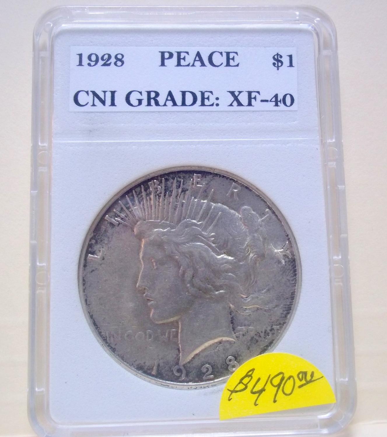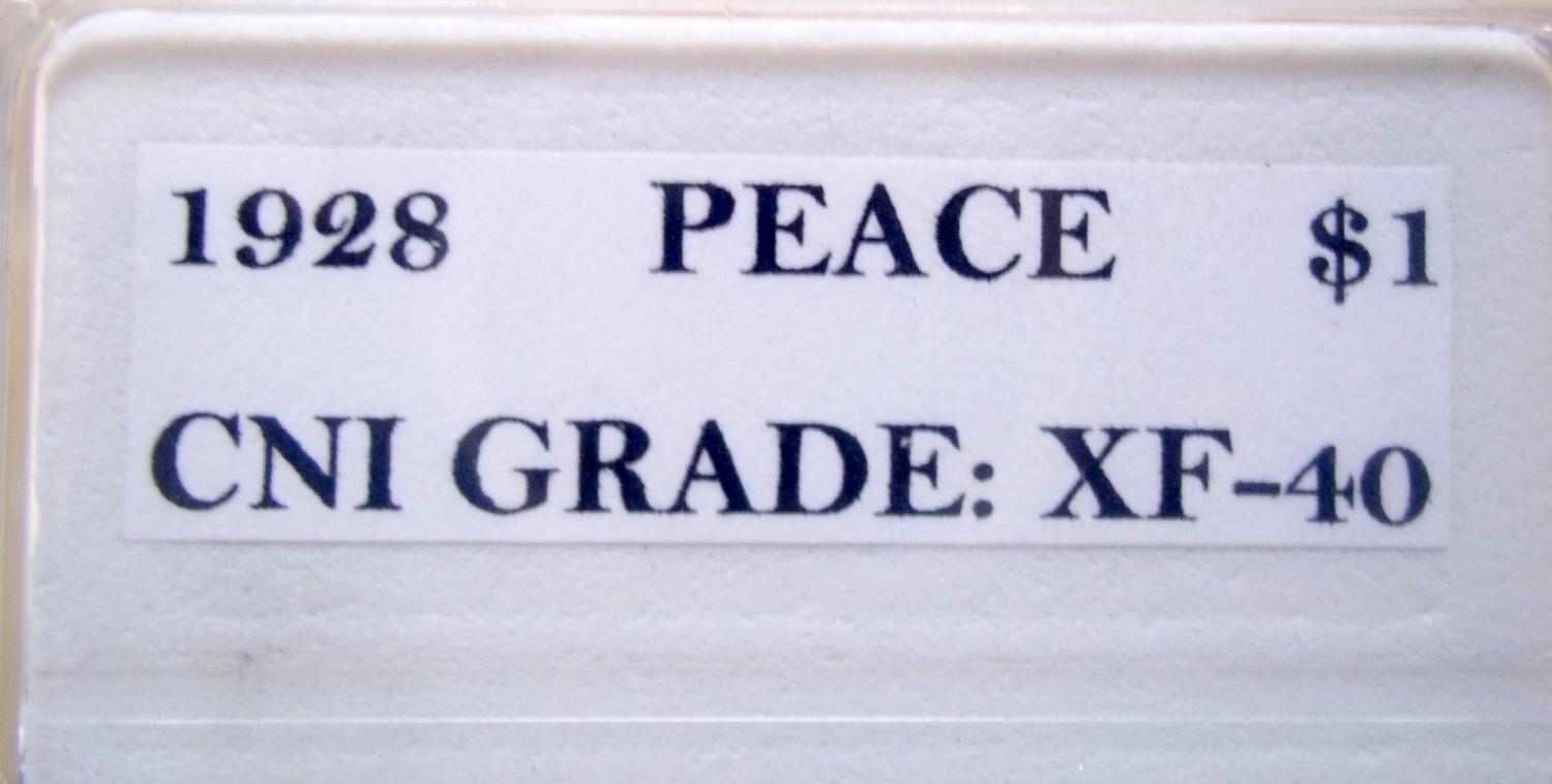Key date Philadelphia Mint 1928 Peace dollar, California Numismatic Investments graded Extremely Fine-40! A difficult coin to locate in high grade. Great investment opportunity for a smart collector!