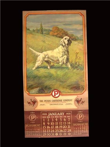 1928 Peters Cartridge Co. Calendar, original band on top with full pad. G. Muss-Arnolt artist depicting white setter. Framed and matted. Minor tears and creases otherwise excellent original condition. Image 15 X 30 inches.