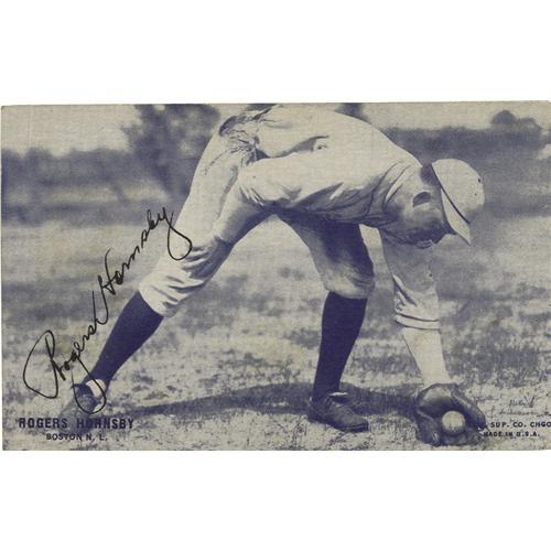 <B>1928 Rogers Hornsby Signed Exhibit Card.</B></I> While the date of the application of a 10/10 black fountain pen signature from this Hall of Fame second baseman is impossible to ascertain, we can assume it corresponds to the 1928 issue of this "Exhibit Supply Co." card that pictures the master at his craft. The blank backed 3.25x5.25" issue presents just the slightest edge and corner wear, and evidence of scrapbook removal on verso does not affect the front. A fine vintage piece that blends top talent and gorgeous aesthetics. <I>LOA from PSA/DNA. LOA from James Spence Authentication.</B></I><BR><BR><b>Shipping:</b> Small Collectibles (<a target="_blank" href="http://www.heritageauctions.com/common/shipping.php">view shipping information</a>)