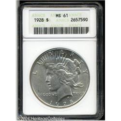 1928 S$1 MS61 ANACS. A meticulously struck, faintl <B>1928 S$1 MS61 ANACS.</B></I> A meticulously struck, faintly toned, and intensely lustrous key date Peace Dollar. A light vertical mark on the cheek prevents a decidedly higher grade. <BR><BR><B>Important notice:</B> Heritage usually auctions material at the rate of 200-250 lots per hour. On some occasions eBay Live bid software or the Internet may not be able to keep up with the pace of the auction. We recommend placing a realistic absentee bid now as insurance to avoid disappointment. Occasionally the auctioneer may eliminate or reject an eBay Live bid, and the auctioneer may also reopen a lot after the close of the eBay live bidding (usually because we missed an audience bid), and may reject your bid even if it shows you as the winning bidder. By bidding via eBay Live, you agree that Heritage may award the lot to another bidder at its sole discretion under the circumstances described above or any other reasonable circumstances. Since eBay bids are not shown to us until we open the lot on the floor, we treat those bids just like floor bids. In most cases the floor responds before the eBay bid is presented to us, due to Internet lag time, so for consistency we have made it a policy that floor bids are always considered first over tie eBay live bids. Also please note that all Heritage lots purchased through eBay Live carry a 20% Buyer's Premium. Please make sure you read the Terms and Conditions before you bid. This lot is being auctioned in conjunction with a live floor auction by Heritage Galleries & Auctioneers. All final auction and invoice information will be supplied by Heritage Galleries & Auctioneers, and all other information should be considered preliminary. Lot:7804