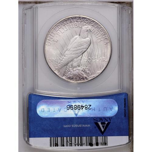 <B>1928<img border='0' src='http://www.heritagecoins.com/images/star.gif' width=10 height=10>$1> MS62 ANACS.</B></I> Well struck, lustrous, and lightly abraded. The medium-gray surfaces are essentially untoned, save for a bit of plum color near the lower reverse rim. One of the key dates in the Peace dollar series.
