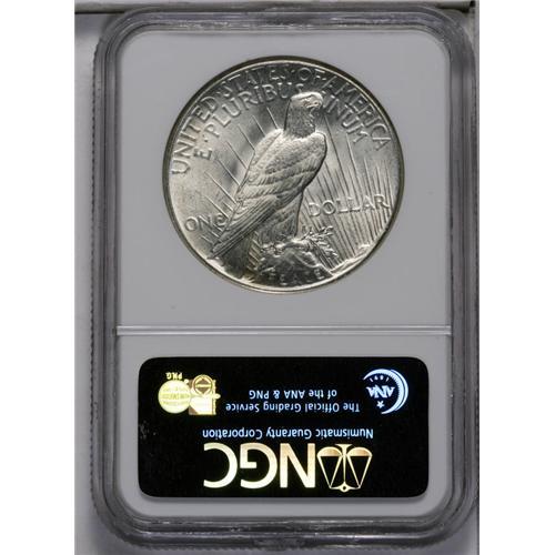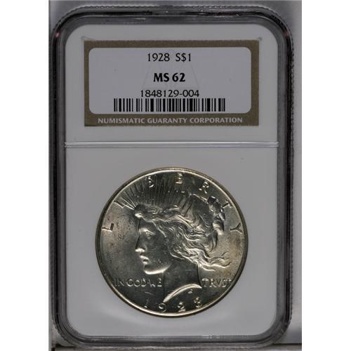 <B>1928<img border='0' src='http://www.heritagecoins.com/images/star.gif' width=10 height=10>$1> MS62 NGC.</B></I> A satiny Mint State example of this key-date issue with bright silver surfaces accented by hints of champagne and gold toning. Many examples of this issue were originally sent from Philadelphia to Pittsburgh, and even today examples are still found in western Pennsylvania and eastern Ohio holdings.