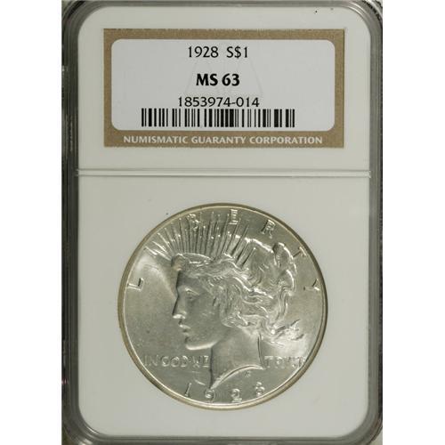 <B>1928 S$1 MS63 NGC.</B></I> This lustrous and well struck example displays several faint luster grazes. This low-mintage issue enjoys consistent popularity with collectors.<BR><BR><b>Shipping:</b> Coins & Currency (<a target="_blank" href="http://www.heritageauctions.com/common/shipping.php">view shipping information</a>)