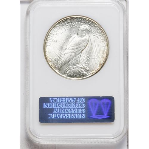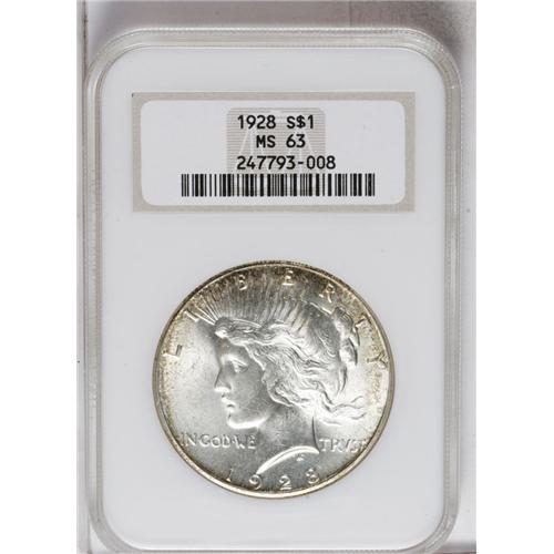 <B>1928<img border='0' src='http://www.heritagecoins.com/images/star.gif' width=10 height=10>$1> MS63 NGC.</B></I> White and flashy in the centers with a thin ring of attractive multicolored patina around the margins. Appropriately designated as Select with several small marks peppering Liberty's portrait and the eagle's feathers.