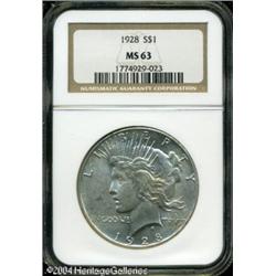 1928 S$1 MS63 NGC. Yellow-beige and pale-blue colo <B>1928 S$1 MS63 NGC.</B></I> Yellow-beige and pale-blue color rests over lustrous surfaces, and the design features are well impressed throughout. Light marks on Liberty's cheek and neck, and on the eagle, limit the grade. <BR><BR><B>Important notice:</B> Heritage usually auctions material at the rate of 200-250 lots per hour. On some occasions eBay Live bid software or the Internet may not be able to keep up with the pace of the auction. We recommend placing a realistic absentee bid now as insurance to avoid disappointment. Occasionally the auctioneer may eliminate or reject an eBay Live bid, and the auctioneer may also reopen a lot after the close of the eBay live bidding (usually because we missed an audience bid), and may reject your bid even if it shows you as the winning bidder. By bidding via eBay Live, you agree that Heritage may award the lot to another bidder at its sole discretion under the circumstances described above or any other reasonable circumstances. Since eBay bids are not shown to us until we open the lot on the floor, we treat those bids just like floor bids. In most cases the floor responds before the eBay bid is presented to us, due to Internet lag time, so for consistency we have made it a policy that floor bids are always considered first over tie eBay live bids. Also please note that all Heritage lots purchased through eBay Live carry a 20% Buyer's Premium. Please make sure you read the Terms and Conditions before you bid. This lot is being auctioned in conjunction with a live floor auction by Heritage Galleries & Auctioneers. All final auction and invoice information will be supplied by Heritage Galleries & Auctioneers, and all other information should be considered preliminary. Lot:7806