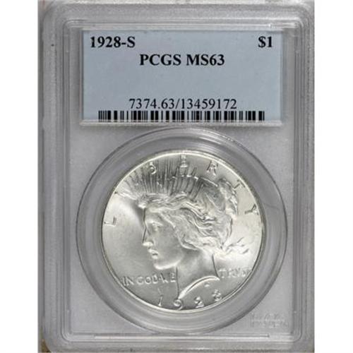 <B>1928-S $1 MS63 PCGS.</B></I> PCGS Population (1562/1489). NGC Census: (1111/1146). Mintage: 1,632,000. Numismedia Wsl. Price for NGC/PCGS coin in MS63: $480. (#7374)<BR><BR><B>Coin Engraver:</B> Anthony de Francisci<BR><BR><b>Shipping:</b> Coins & Currency (<a target="_blank" href="http://www.heritageauctions.com/common/shipping.php">view shipping information</a>)