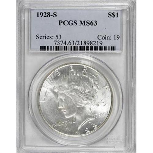 <B>1928-S $1 MS63 PCGS.</B></I> PCGS Population (1565/1490). NGC Census: (1111/1146). Mintage: 1,632,000. Numismedia Wsl. Price for NGC/PCGS coin in MS63: $480. (#7374)<BR><BR><B>Coin Engraver:</B> Anthony de Francisci<BR><BR><b>Shipping:</b> Coins & Currency (<a target="_blank" href="http://www.heritageauctions.com/common/shipping.php">view shipping information</a>)