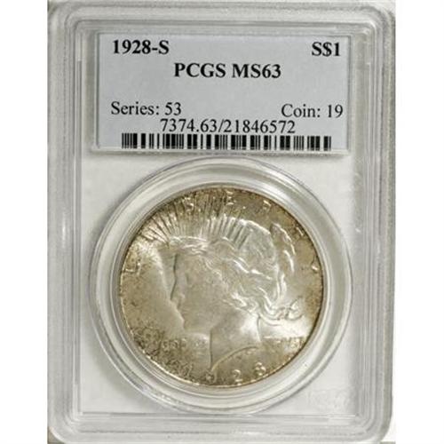 <B>1928-S $1 MS63 PCGS.</B></I> PCGS Population (1584/1546). NGC Census: (1111/1146). Mintage: 1,632,000. Numismedia Wsl. Price for NGC/PCGS coin in MS63: $480. (#7374)<BR><BR><B>Coin Engraver:</B> Anthony de Francisci<BR><BR><b>Shipping:</b> Coins & Currency (<a target="_blank" href="http://www.heritageauctions.com/common/shipping.php">view shipping information</a>)