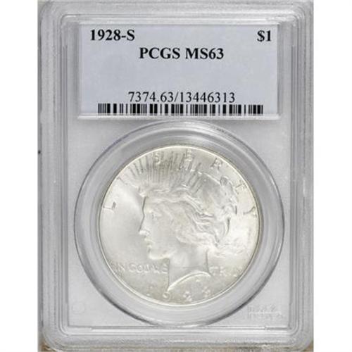 <B>1928-S $1 MS63 PCGS.</B></I> PCGS Population (1605/1569). NGC Census: (1131/1163). Mintage: 1,632,000. Numismedia Wsl. Price for NGC/PCGS coin in MS63: $480. (#7374)<BR><BR><B>Coin Engraver:</B> Anthony de Francisci<BR><BR><b>Shipping:</b> Coins & Currency (<a target="_blank" href="http://www.heritageauctions.com/common/shipping.php">view shipping information</a>)