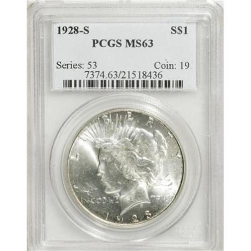 <B>1928-S $1 MS63 PCGS.</B></I> PCGS Population (1605/1569). NGC Census: (1132/1168). Mintage: 1,632,000. Numismedia Wsl. Price for NGC/PCGS coin in MS63: $480. (#7374)<BR><BR><B>Coin Engraver:</B> Anthony de Francisci<BR><BR><b>Shipping:</b> Coins & Currency (<a target="_blank" href="http://www.heritageauctions.com/common/shipping.php">view shipping information</a>)