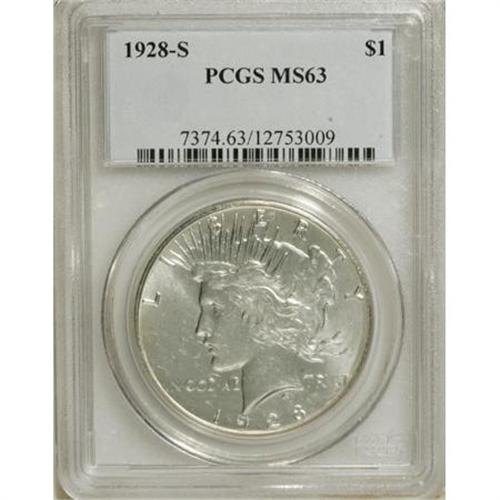 <B>1928-S $1 MS63 PCGS.</B></I> PCGS Population (1650/1619). NGC Census: (1143/1193). Mintage: 1,632,000. Numismedia Wsl. Price for NGC/PCGS coin in MS63: $480. (#7374)<BR><BR><B>Coin Engraver:</B> Anthony de Francisci<BR><BR><b>Shipping:</b> Coins & Currency (<a target="_blank" href="http://www.heritageauctions.com/common/shipping.php">view shipping information</a>)