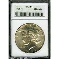 1928 S$1 MS64 ANACS. Blushes of apricot patina are <B>1928 S$1 MS64 ANACS.</B></I> Blushes of apricot patina are more extensive on the reverse of this lustrous and carefully preserved Choice key date Dollar. The obverse is especially attractive. <BR><BR><B>Important notice:</B> Heritage usually auctions material at the rate of 200-250 lots per hour. On some occasions eBay Live bid software or the Internet may not be able to keep up with the pace of the auction. We recommend placing a realistic absentee bid now as insurance to avoid disappointment. Occasionally the auctioneer may eliminate or reject an eBay Live bid, and the auctioneer may also reopen a lot after the close of the eBay live bidding (usually because we missed an audience bid), and may reject your bid even if it shows you as the winning bidder. By bidding via eBay Live, you agree that Heritage may award the lot to another bidder at its sole discretion under the circumstances described above or any other reasonable circumstances. Since eBay bids are not shown to us until we open the lot on the floor, we treat those bids just like floor bids. In most cases the floor responds before the eBay bid is presented to us, due to Internet lag time, so for consistency we have made it a policy that floor bids are always considered first over tie eBay live bids. Also please note that all Heritage lots purchased through eBay Live carry a 20% Buyer's Premium. Please make sure you read the Terms and Conditions before you bid. This lot is being auctioned in conjunction with a live floor auction by Heritage Galleries & Auctioneers. All final auction and invoice information will be supplied by Heritage Galleries & Auctioneers, and all other information should be considered preliminary. Lot:7809