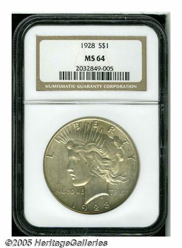 <B>1928<S$1> MS64 NGC.</B></I> Ivory-gray patina covers each side of this near-Gem example of this semi-key issue that had the lowest mintage in the series of 360,649 pieces.