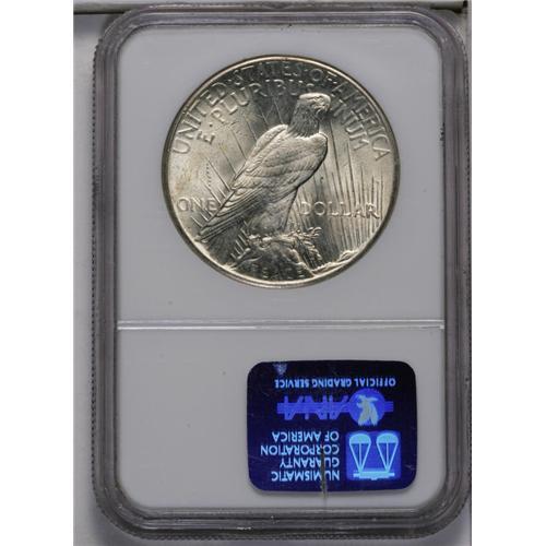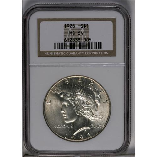<B>1928<img border='0' src='http://www.heritagecoins.com/images/star.gif' width=10 height=10>$1> MS64 NGC.</B></I> One of the key dates to the series and a very clean example nearly void of the troublesome abrasions that so often plague Peace dollars. Bright, nearly untoned surfaces display sharply defined design elements.