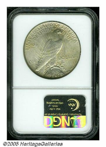 <B>1928<S$1> MS64 NGC.</B></I> The low mintage of only 360,649 coins is the smallest production figure in the Peace Dollar series, except for the 1922 High Relief. This attractive near-Gem is well struck and lustrous, with scattered areas of light golden coloration on the otherwise silver-gray surfaces. The reverse is well preserved, while the lower obverse reveals a handful of minor contact marks.