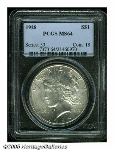 <B>1928<S$1> MS64 PCGS.</B></I> A fully struck and brilliant example of this scarce issue. A few small abrasions are scattered over each side, which account for the grade.