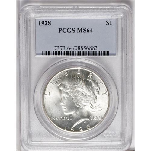 <B>1928<img border='0' src='http://www.heritagecoins.com/images/star.gif' width=10 height=10>$1> MS64 PCGS.</B></I> Appropriately graded, with booming luster that dominates the eye. As is usual, slight softness is encountered in the centers, but it does not diminish the desirability.