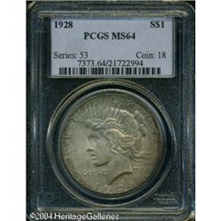 1928 S$1 MS64 PCGS. Lustrous surfaces are visited <B>1928 S$1 MS64 PCGS.</B></I> Lustrous surfaces are visited by medium olive color, and show a couple of trivial grade-defining marks. <BR><BR><B>Important notice:</B> Heritage usually auctions material at the rate of 200-250 lots per hour. On some occasions eBay Live bid software or the Internet may not be able to keep up with the pace of the auction. We recommend placing a realistic absentee bid now as insurance to avoid disappointment. Occasionally the auctioneer may eliminate or reject an eBay Live bid, and the auctioneer may also reopen a lot after the close of the eBay live bidding (usually because we missed an audience bid), and may reject your bid even if it shows you as the winning bidder. By bidding via eBay Live, you agree that Heritage may award the lot to another bidder at its sole discretion under the circumstances described above or any other reasonable circumstances. Since eBay bids are not shown to us until we open the lot on the floor, we treat those bids just like floor bids. In most cases the floor responds before the eBay bid is presented to us, due to Internet lag time, so for consistency we have made it a policy that floor bids are always considered first over tie eBay live bids. Also please note that all Heritage lots purchased through eBay Live carry a 20% Buyer's Premium. Please make sure you read the Terms and Conditions before you bid. This lot is being auctioned in conjunction with a live floor auction by Heritage Galleries & Auctioneers. All final auction and invoice information will be supplied by Heritage Galleries & Auctioneers, and all other information should be considered preliminary. Lot:7808